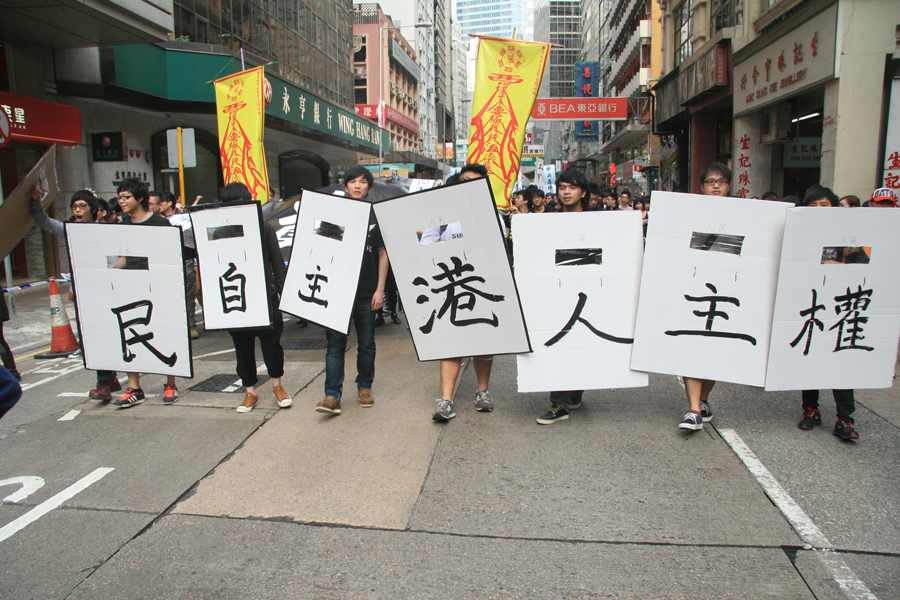 On Queen’s Road in Central, all together against the central government’s. Out of 7 million inhabitants in Hong Kong, only 1,200 have the voting right. In other words, Hong Kong people have no say in who becomes their Chief Executive. They want the situation to change.