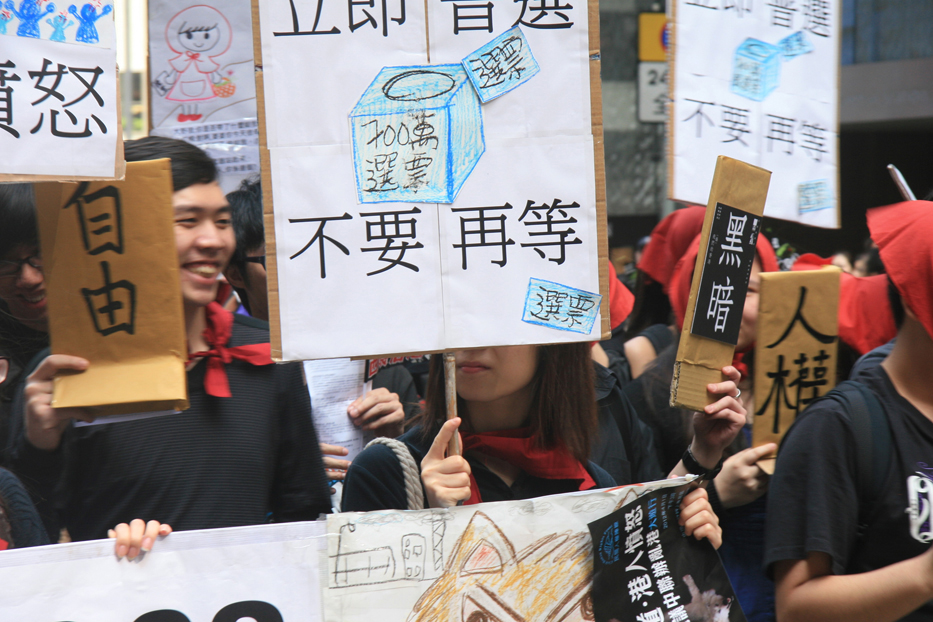 Demonstrators chanting. The universal suffrage for a Chief Executive remains a controversial issue in Hong Kong.